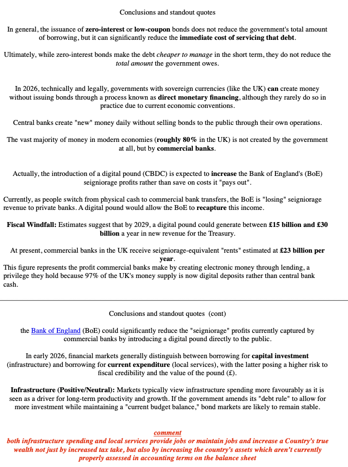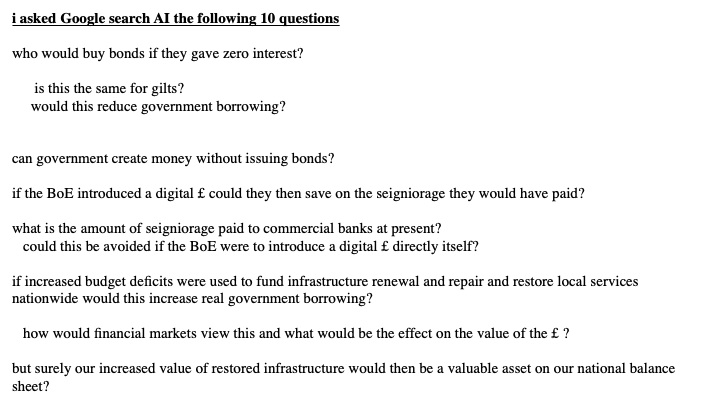 i asked Google AI 10 Qu's on govt spending 0% bonds creating £ without issuing bonds, on BoE digital £ & stopping huge our seigniorage payments ↑ value of restored infrastructure ↑spend which would then be a valuable asset on our national balance sheet